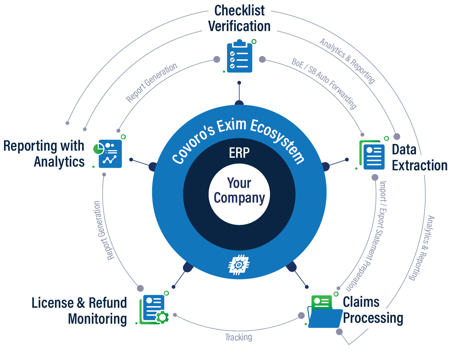 COVORO’s Agentic AI-powered Exim Ecosystem seamlessly integrates with your ERP to automate and optimize every step of your EXIM operations. From intelligent data extraction and checklist verification to automated claims processing and license/refund monitoring, the ecosystem ensures accuracy, compliance, and speed. Advanced analytics and reporting provide actionable insights, while automated statement preparation and tracking eliminate manual effort—empowering your company to achieve faster turnaround times, reduce operational risk, and maximize export-import efficiency.