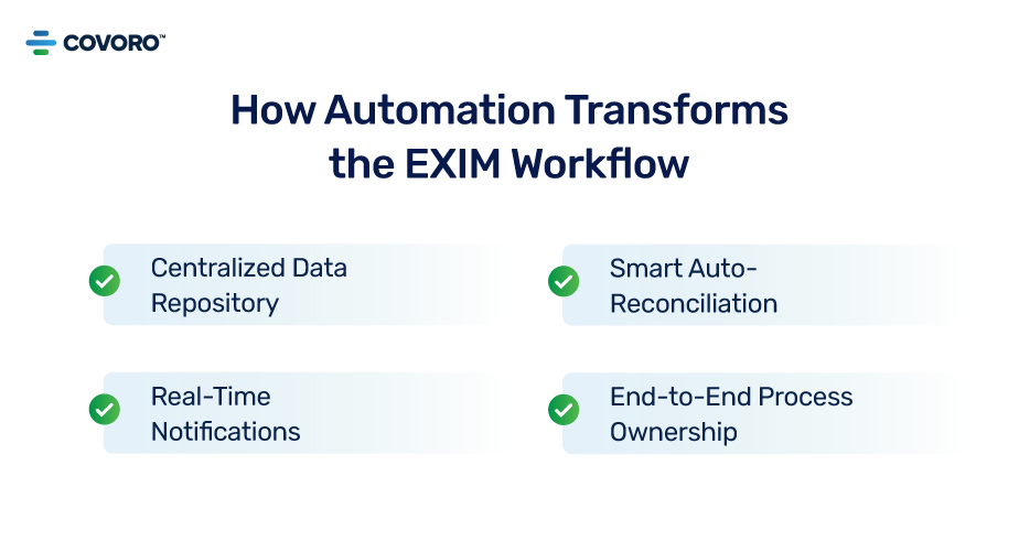 Automation doesn’t just make documentation faster; it makes it smarter. COVORO’s platform connects every stage of the EXIM process into one seamless workflow: